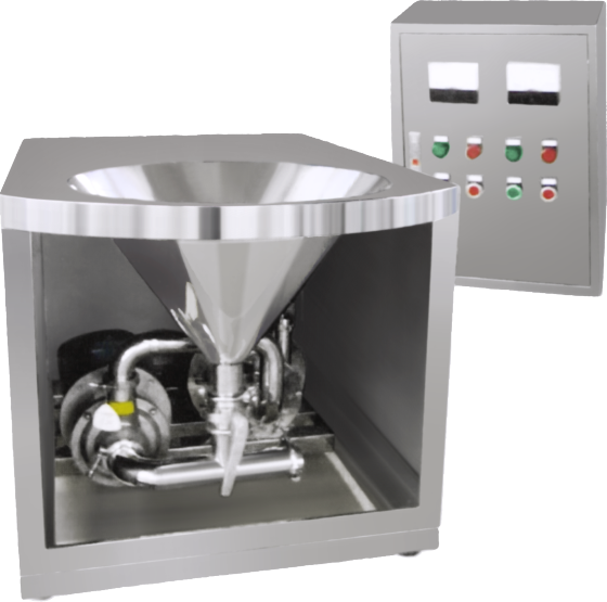 高效混合機是由JQJ1-170剪切機、CIP-B30自吸泵和控制柜三部分組成,剪切機是利用定子、轉子之間狹窄間隙中形成的紊流對物料進(jìn)行高速、強烈的液力剪切、離心擠壓、撞擊和研磨來(lái)完成物料的連續分散、乳化及粉碎。定轉子采用新型齒形組合。定子與轉子均采用高強度不銹鋼,表面并經(jīng)過(guò)特殊硬化處理精密制造而成,電機采用電機直聯(lián)形式,電機軸采用特殊不銹鋼。